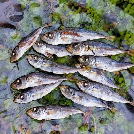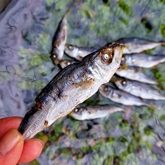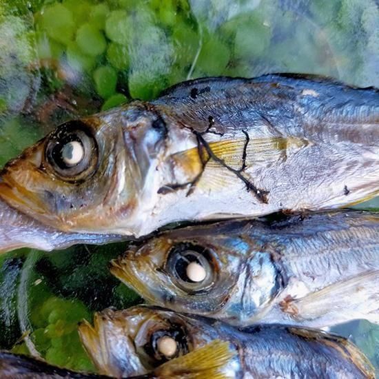 ※アジ本体に海藻が付着している場合がありますが、食べても問題はありません。また、漁や日干しの時に使用した糸状の網が絡んでいることが稀にあります。取り除いて給餌してください。